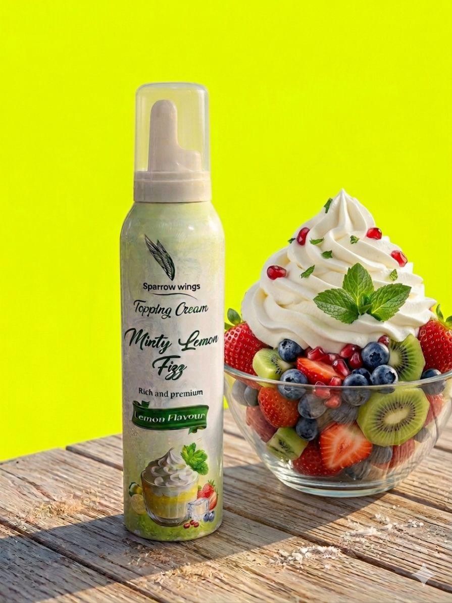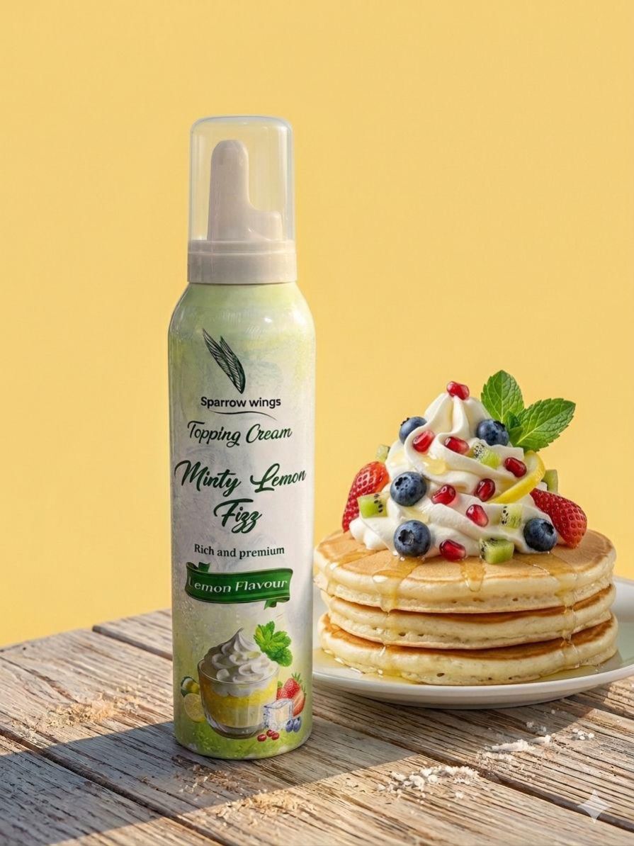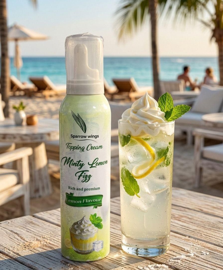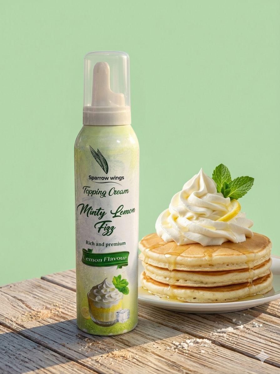 Minty Lemon Fizz is a refreshing, zesty, ready-to-use lemon-flavoured whipped cream. It has a creamy texture with a minty-citrus taste, perfect for enhancing desserts and drinks. Best for cakes, cupcakes, cheesecakes, pancakes, fruit bowls, mocktails, summer drinks, dessert jars, waffles, and festive treats.